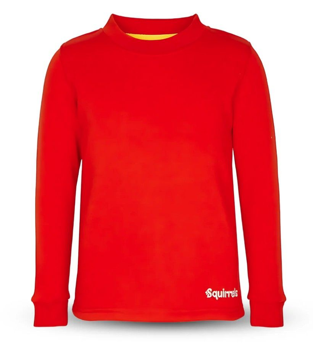 Red Squirrel Scout Sweatshirt with yellow to collar. Beaver logo embroidered to bottom left of sweatshirt.